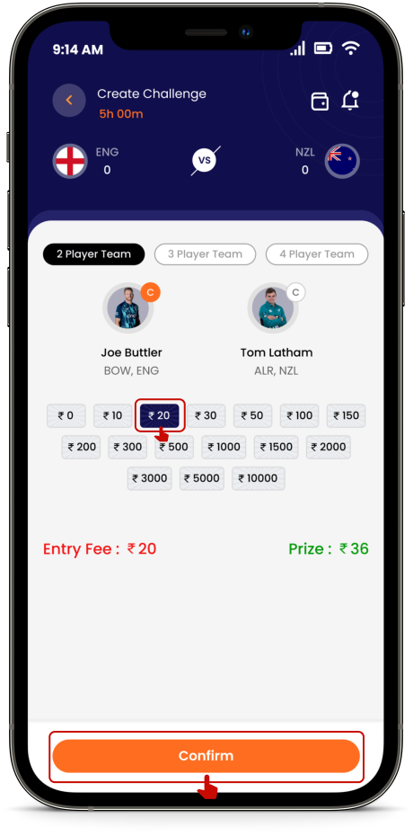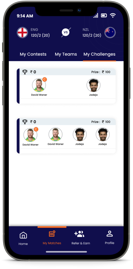 Fantasy gaming is even more fun and easier when you play with h2h fantasy. Simply choose a team of 2, 3 or 4 players from any of the upcoming match, create your own challenge and decide the challenge amount. If you are accepting an already created challenge, you need to match the challenge amount and then create your own Fantasy Team. (Pictures Below)