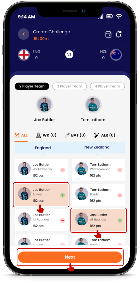 Please Note: For 2 and 3 players team, minimum one player has to be from each team. For a team of 4 players, you have to choose 2 players from each team